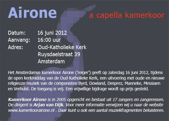 Muziek op zaterdagmiddag 16 juni Gepubliceerd op door Webmaster OKK7 juni 2012 Op zaterdagmiddag 16 juni zal het Amsterdamse a capella kamerkoor ‘Airone’ een concert geven met prachtige religieuze werken. Allen zijn welkom!