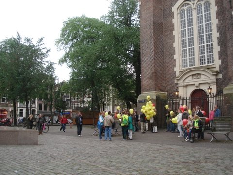 “Kerkennachtamsterdam 2013” werd geopend bij het Homomonument op de Westermarkt. Het verhaal was kort en we woeien bijna met z’n allen het water in met alle ballonnen, gele en rode! Een paar woorden bleven hangen: “in de Kerk zijn twee zaken het meest belangrijk: de mensen en de gebouwen”.