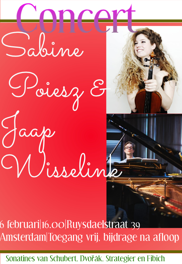 U bent van harte welkom bij het concert van violiste Sabine Poiesz en pianist Jaap Wisselink op zaterdag 6 februari om 16:00 uur. Zij spelen sonatines van Schubert, Dvoråk, Strategier en Fibich. Toegang is vrij, bijdrage na afloop.