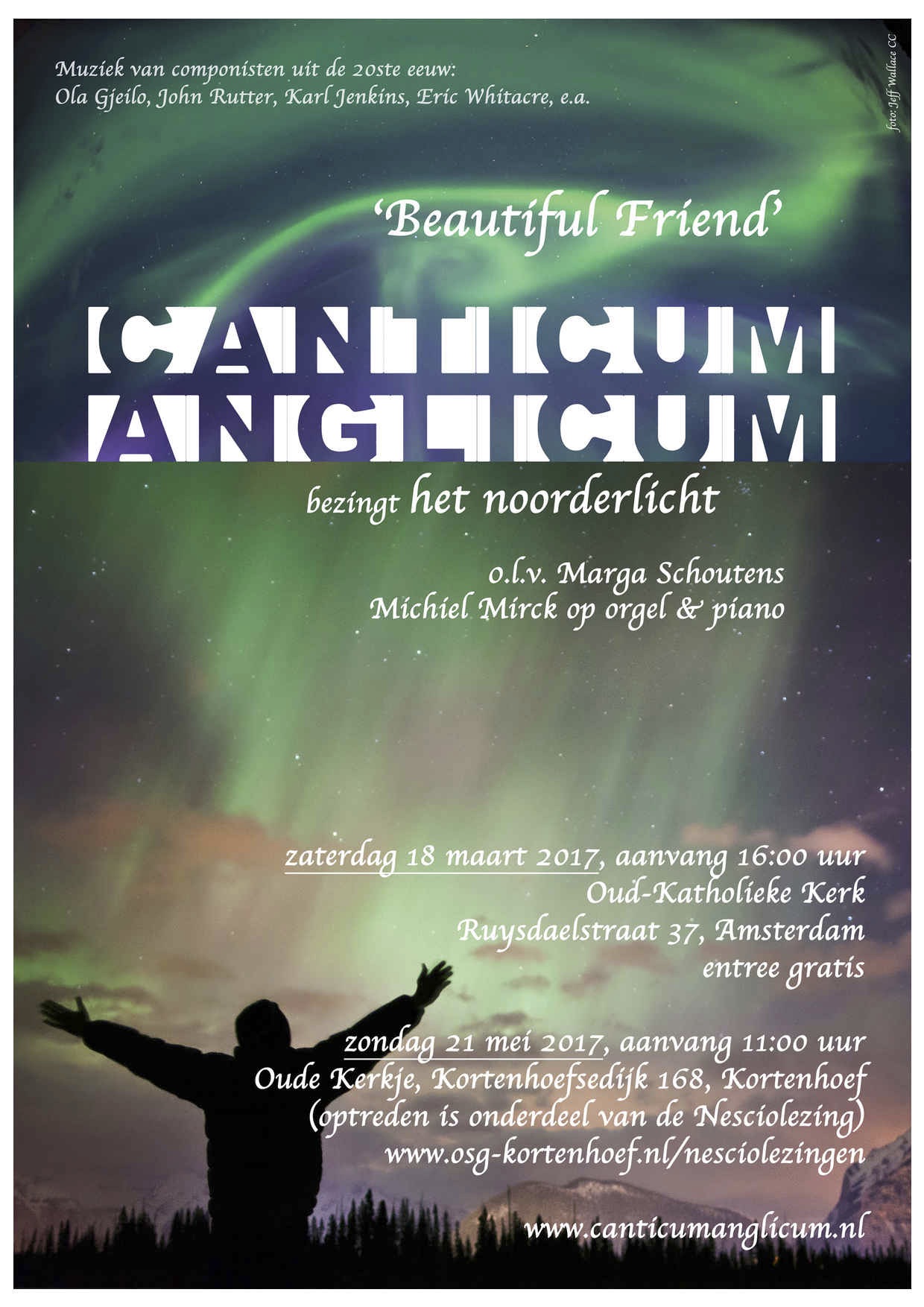 Onder de titel ‘Beautiful Friend’ bezingt het koor Canticum Anglicum (van de Vredeskerk in Amsterdam), onder leiding van Marga Schoutens het noorderlicht. Michiel Mirck speelt daarbij orgel en piano. Op het programma staan werken van componisten uit de 20e eeuw: Ola Gjeilo, John Rutter, Karl Jenkins, Eric Whitacre e.a. Het concert is van 16:00 – 17:00 in de Oud-Katholieke Kerk, Ruysdaelstraat 39. De toegang is vrij, na afloop wordt er een collecte gehouden. U bent van harte welkom!
