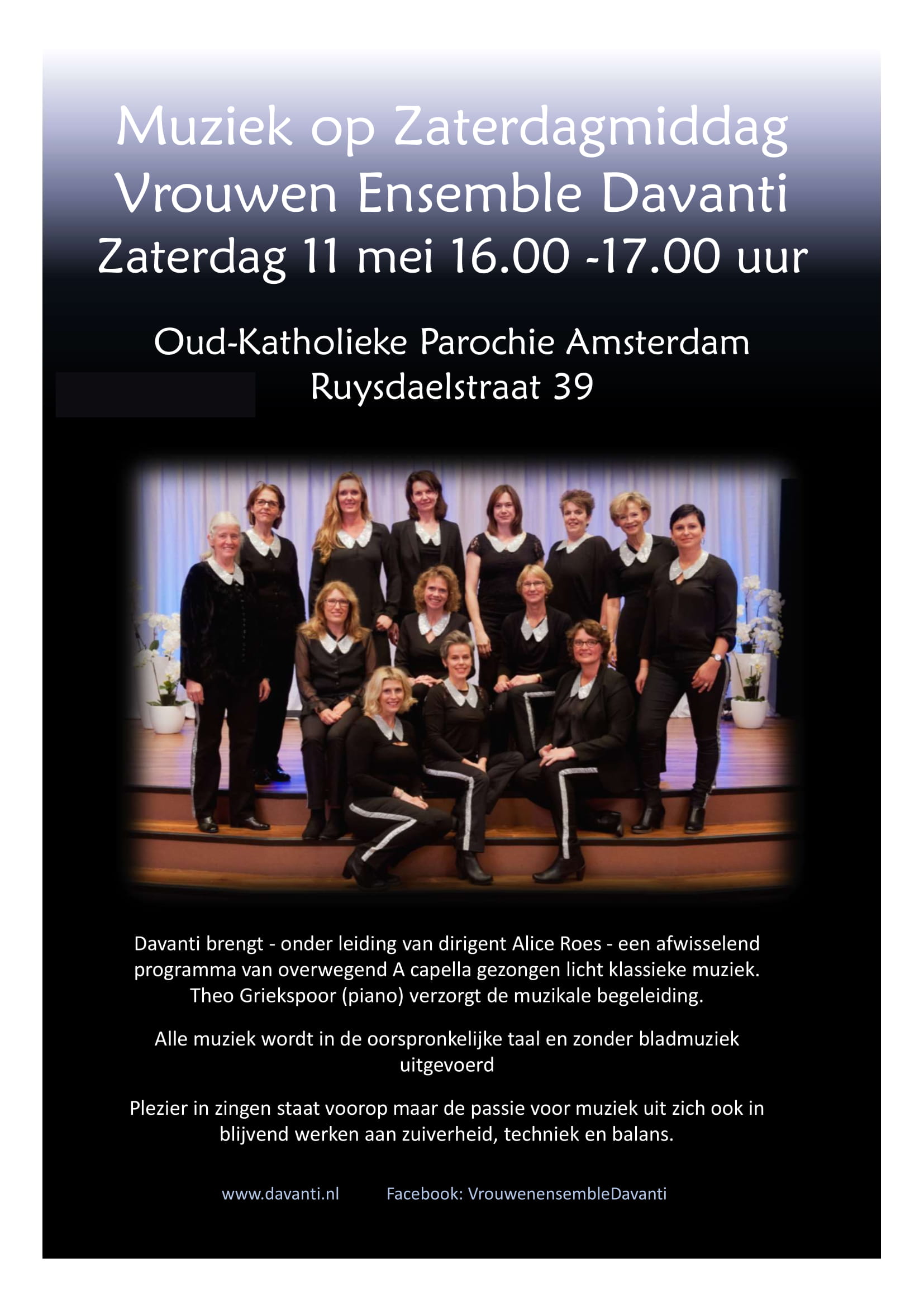Op zaterdagmiddag 11 mei zal Vrouwen Ensemble Davanti muziek ten gehore brengen in de Oud-Katholieke parochie van Amsterdam aan de Ruysdaelstraat 39.