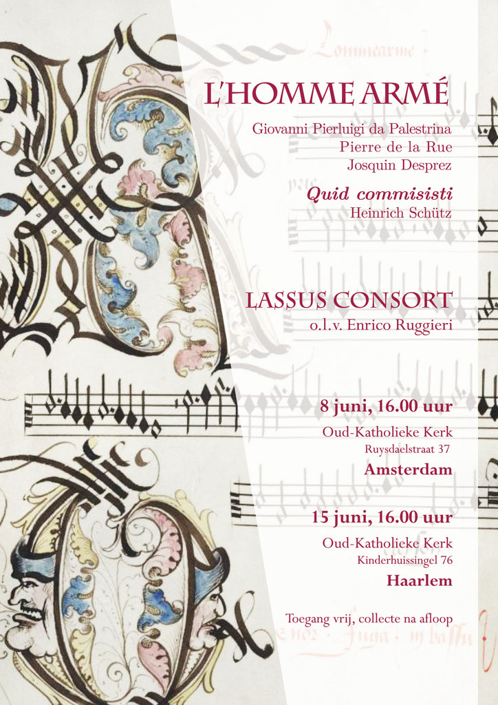 Op zaterdag 8 juni van 16.00-17.00 uur zal het Lassus Consort onder leiding van Enrico Ruggieri een concert geven in de Oud-Katholieke Kerk, Ruysdaelstraat 37, Amsterdam. Op het programma, getiteld l’Homme Armé, staan gedeelten uit missen die Pierre de la Rue (1452-1518), Josquin Desprez (ca 1450-1521) en Giovanni Pierluigi da Palestrina (1525-1594) op dit muzikale thema componeerden: spectaculaire polyfone muziek! Ook zal een van de Cantiones Sacrae van Heinrich Schuetz (1585-1672), getiteld ‘Quid commisisti’ ten gehore worden gebracht. De toegang is vrij; er is een collecte na afloop.