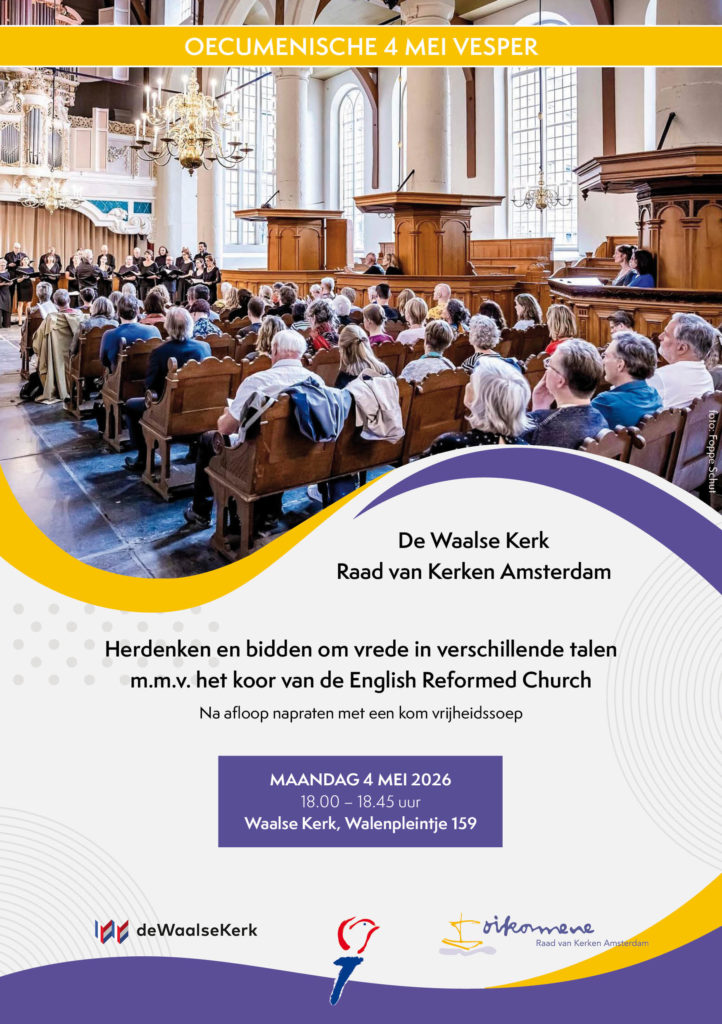 De vesper wordt voorbereid door ds. Joost Röselaers (Waalse Kerk), Margriet Dijkmans van Gunst (Vrijburg), Michael van der Werf (Deutsche Evangelische Gemeinde) en ds. Marius Louw (ERC, Engelse Kerk op het Begijnhof). We zingen en bidden in verschillende talen – talen die in sommige tijden en in sommige contexten de taal van de agressor waren of zijn, maar die we nu, hier, in alle eenvoud laten klinken in een smeekbede om vrede, in een lied over verzoening. Het koor van de Engelse Kerk verleent medewerking. Na afloop is er gelegenheid tot napraten met een kom vrijheidssoep! En bij voldoende belangstelling lopen we daarna gezamenlijk naar het Rokin om aan te sluiten bij de Nationale Herdenking.